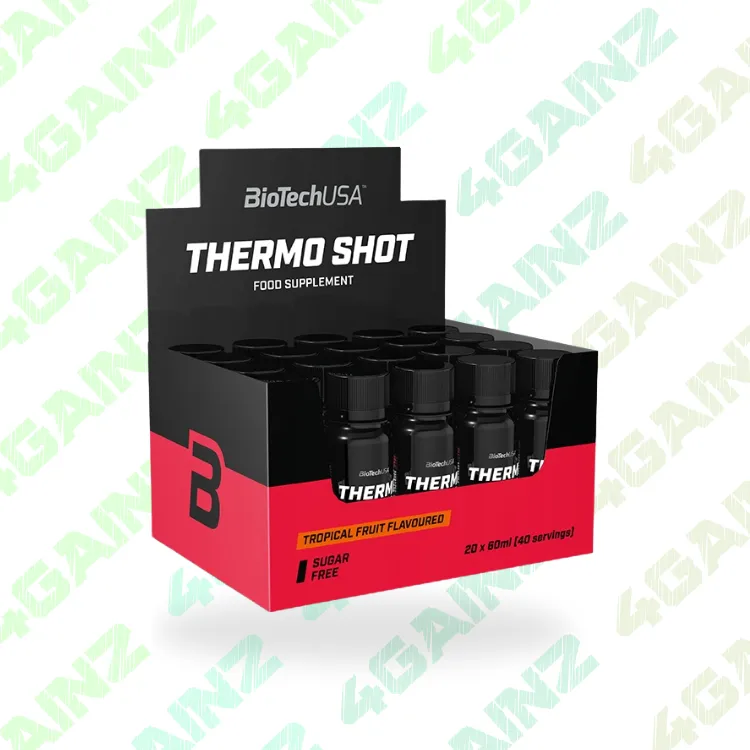 BioTechUSA Thermo Shot yra koncentruotas, termogeninis skystis, skirtas palaikyti riebalų deginimą ir energijos lygį, praturtintas L-karnitinu ir cholinu. Šis patogus paketas su 20 atskirų „shotų“ idealiai tinka ilgalaikiam vartojimui.