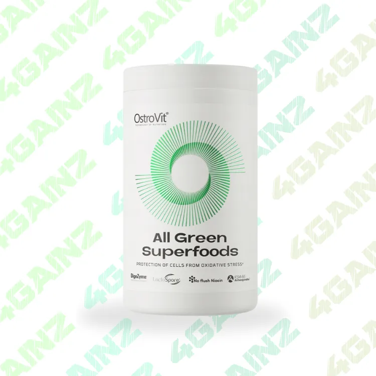 OstroVit All Green Superfoods yra kompleksinis miltelių pavidalo maisto papildas, apjungiantis žaliuosius supermaistus, virškinimo fermentus ir probiotikus. Šis produktas sukurtas palaikyti virškinimo sistemos veiklą, stiprinti imunitetą ir kovoti su oksidaciniu stresu.